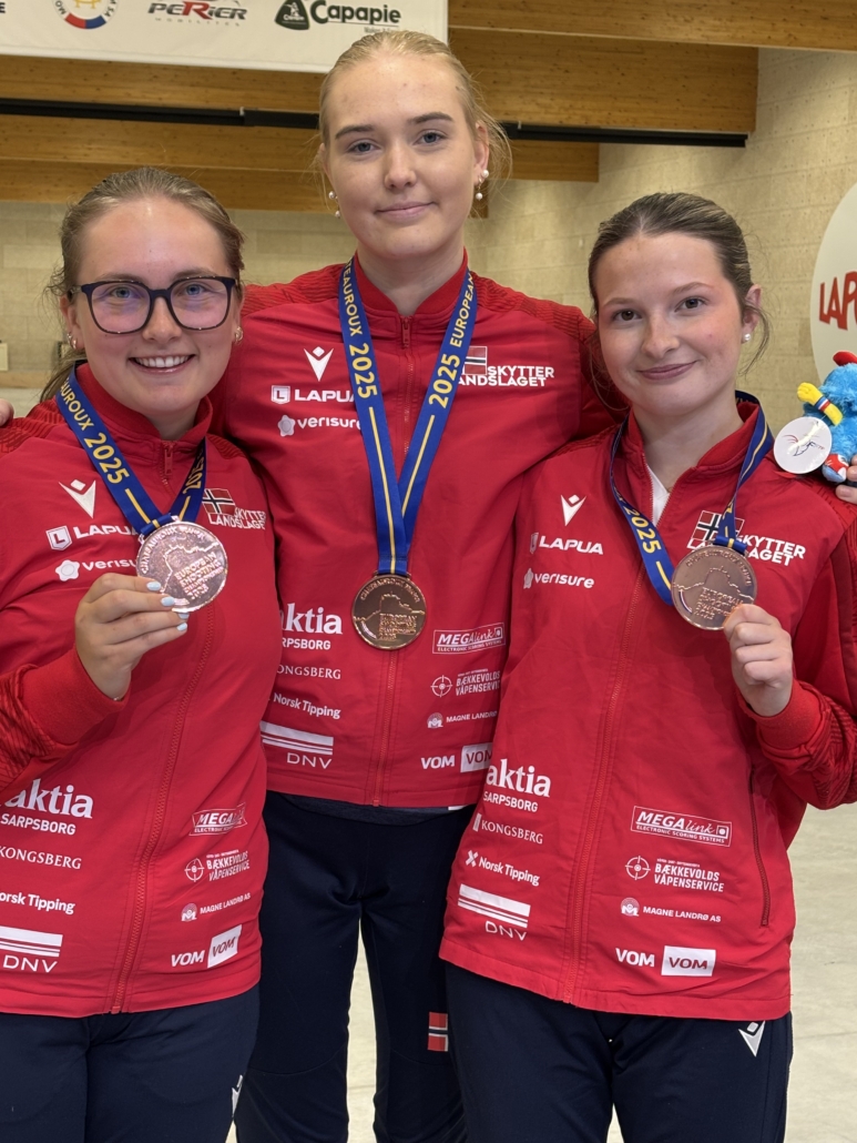 Jeanette Hegg Duestad fortsetter å imponere i EM i Frankrike, denne gangen på 300m. Jeanette tok gullet på 300m rifle match, og det gjorde hun like godt med å sette verdensrekord i øvelsen med 591 poeng! Hun slo sin egen rekord fra VM i Kairo i 2022 med tre poeng. Og ikke nok med det! Det ble også laggull for Jeanette, Jenny Vatne og Oda Flikkerud. Med poengsummen 1759 ble det også verdensrekord på lag. Den forrige rekorden ble slått med 7 poeng, og den rekorden var det Jeanette, Jenny og Katrine Lund som satte i samme Kairo-VM.