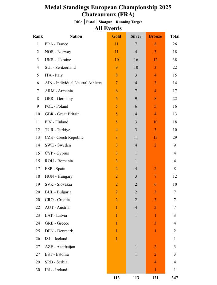 Den norske troppen gjennomførte et imponerende mesterskap da europa-eliten i juli/august var samlet til EM i OL 2024-anleggene i Chateauroux i Frankrike. Etter totalt 11 konkurransedager kunne de norske skytterne se tilbake på en lang rekke pallplasser og andre topplasseringer. Totalt ble medaljefangsten 11 gull, 4 sølv og 3 bronse, i den offisielle medaljestatistikken var det bare Frankrike som var bedre med rekken 11-7-8. Også om man teller antall medaljer var Norge med sine 18 på topp 6, her var Ukraina best med 38 (10-16-12).
