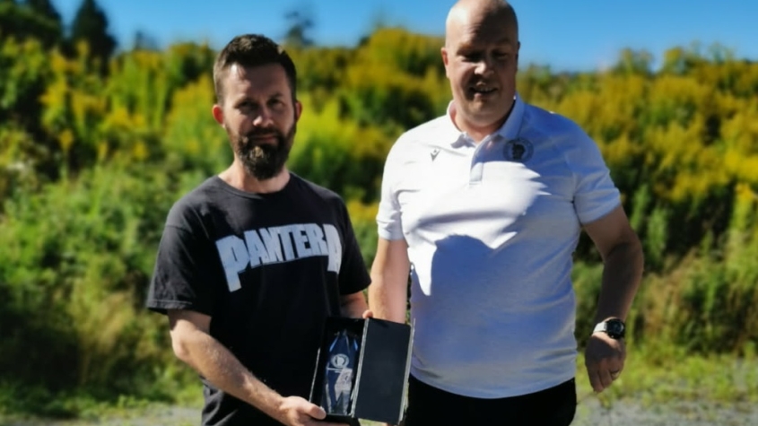 Bildet: Til venstre Espen Krogstad, til høyre Kenneth Eikenes fra Breddeidrettskomiteen, som delte ut statuetten.